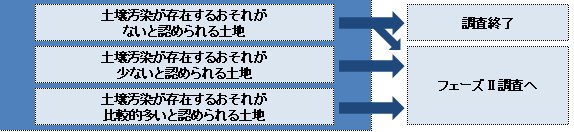 ・工事計画書(※法第4条調査の場合)調査の結果により、対象物質を特定して、下記のように土壌汚染のおそれの区分を分類します。土壌汚染のおそれがある場合はフェーズⅡ調査へ移行します。自主調査の場合は土壌汚染のおそれがない場合でもフェーズⅡ調査を行うこともあります。