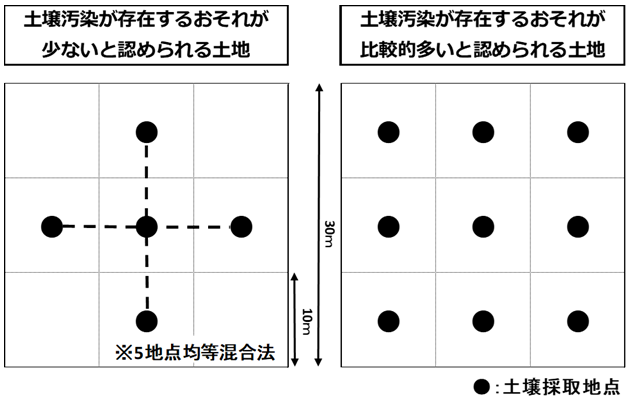 土壌汚染が存在するおそれが比較的多いと認められる土地では100㎡(10m区画ごと)に1地点採取し分析を行います。土壌汚染が存在するおそれが少ないと認められる土地では900㎡(30m格子ごと)に5地点採取します。その際、5地点均等混合法にて1検体として分析を行います。