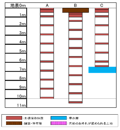 フェーズⅡ調査の結果判明した汚染区画において、分析試料の採取を行う際の基本的な深度を次の①~③に示します。